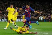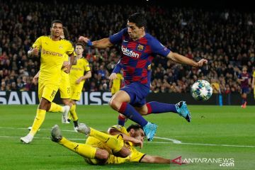 Pesepak bola Barcelona Luis Suarez (kanan) berupaya melewati pesepak bola Borussia Dortmund Mats Hummels dalam laga match day kelima Group F, Liga Champions, di Stadion Camp Nou, Barcelona, Spanyol, Rabu (27/11/2019). Barcelona mengalahkan Dortmund 3-1 dan berhak melaju babak 16 besar Liga Champions. ANTARA FOTO/Reuters-Albert Gea/hp.