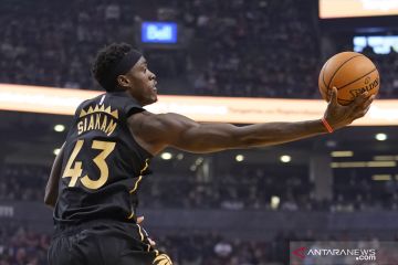 Pebasket Toronto Raptors Pascal Siakam (43) berupaya memasukkan bola ke ring lawannya New York Knicks dalam laga lanjutan NBA, di Scotiabank Arena, Toronto, Ontario, Kanada, Rabu (27/11/2019). Toronto Raptors berhasil mengalahkan New York Knicks 126-98 ANTARA FOTO/Reuters-John E. Sokolowski-USA TODAY Sports/hp.