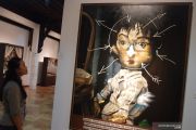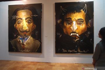 Seorang pengunjung memperhatikan 2 lukisan lukisan berjudul Potret Diri Bagai Vampir karya perupa Pupuk DP, dalam pameran seni rupa tunggalnya bertajuk Kerak Residu, di galeri Bentara Budaya, Jakarta, Jumat (29/11/2019). Pameran Pupuk DP (Daru Purnomo), 55, lahir di Jogya, dan kuliah seni rupa di ISI Jogja ini, akan berlangsung hingga 7 Desember 2019. ANTARA FOTO/Dodo Karundeng/hp.