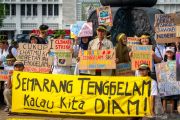 Massa dari berbagai organisasi lingkungan membawa poster tentang krisis iklim saat aksi Jeda Untuk Iklim (Climate Strike) di Kawasan Tugu Muda, Semarang, Jawa Tengah, Jumat (29/11/2019). Dalam aksi tersebut massa menuntut pemerintah untuk serius mengatasi dampak perubahan iklim akibat perusakan dan pembakaran hutan serta mengajak masyarakat untuk peduli terhadap lingkungan. ANTARA FOTO/Aji Styawan/foc.