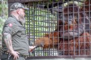Petugas merawat orang utan yang bernama Iskandar di Pusat Suaka Orangutan (PSO) Arsari di Penajam Paser Utara, Kalimantan Timur, Senin (2/12/2019). PSO Arsari adalah fasilitas suaka (sanctuary) bagi orangutan, kerjasama Yayasan Arsari Djojohadikusmo dengan balai konservasi sumber daya alam Kalimantan timur Kementerian Lingkungan Hidup dan Kehutanan. ANTARA FOTO/Yulius Satria Wijaya/hp.