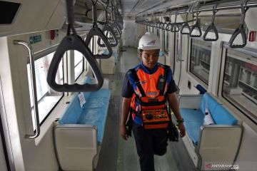 Petugas melintasi gerbong kereta 'light rail train' atau lintas rel terpadu (LRT) di Stasiun Harjamukti, Cimanggis, Kota Depok, Jawa Barat, Rabu (4/12/2019). Pemerintah menargetkan LRT Jabodebek koridor Cibubur-Dukuh Atas dapat beroperasi pada 2021 dengan kapasitas 250 orang per gerbong dengan waktu tunggu tak lebih dari 3 menit, serta dengan tiket seharga Rp12 ribu per penumpang. ANTARA FOTO/Aditya Pradana Putra/hp.