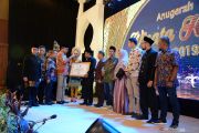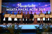 Plt Gubernur Aceh, Nova Iriansyah ( ketiga kiri) didampingi Ketua Perkumpulan Pariwisata Halal Indonesia (PPHI), Riyanto Sofian (kiri) memberikan Anugerah Wisata Halal kepada sejumlah pelaku dan pegiat wisata di Banda Aceh, Jumat (6/12/2019) malam. PPHI Aceh tahun 2020 fokus pada peningkatan wisata halal, budaya halal dan sertifikasi halal dengan mengoptimalkan potensi daerah, infrastruktur dan pelayanan publik dalam upaya meningkatkan kunjungan wisatawan. ANTARA FOTO/Ampelsa/hp.