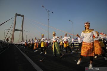 Peserta membawakan Tari Sajojo saat memperingati Hari Ibu di bentang tengah Jembatan Suramadu, Surabaya, Jawa Timur, Sabtu (7/12/2019). Kegiatan tersebut diikuti 2.300 peserta yang terdiri dari anggota Polri, Ibu-ibu Bhayangkari, Persit, PKK, Dharma Wanita dan Pramuka. ANTARA FOTO/Moch Asim/hp.