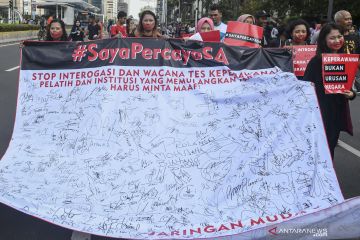 Anggota Kelompok Jaringan Muda Setara menggelar aksi solidaritas bagi atlet senam lantai, SA (17) yang dicoret dari pemusatan latihan nasional (pelatnas) SEA Games karena dituduh tak perawan, saat kegiatan car free day, di Kawasan Bunderan Hotel Indonesia, Jakarta, Minggu (8/12/2019). Aksi tersebut menuntut agar pelatih yang memulangkan SA meminta maaf dan negara melakukan pemulihan terhadap nama korban. ANTARA FOTO/Galih Pradipta/ama.