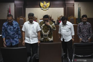 (dari kiri) Direktur Komersil PTPN VII Ahmad Sudarto, Direktur Komersil PTPN XI Sucipto Prayogo, Direktur Komersil PTPN XII Wien Irwanto, Direktur Komersil PTPN IX Rudi Harjito, Direktur Komersil PTPN XIV Hariyanto bersiap memberikan keterangan saksi pada sidang lanjutan kasus suap distribusi gula di Pengadilan Tipikor, Jakarta, Senin (9/12/2019). Lima Direktur Komersil PTPN VII, PTPN XI, PTPN XII, PTPN IX dan PTPN XIV menjadi saksi untuk Terdakwa kasus suap distribusi gula Pieko Njoto. ANTARA FOTO/Nova Wahyudi/foc.