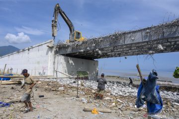 Pekerja menggunakan alat berat untuk merobohkan rangka Jembatan Palu IV di Pantai Kampung Lere, Palu, Sulawesi Tengah, Rabu (11/12/2019). Jembatan yang pernah menjadi ikon Kota Palu dan ambruk saat gempa dan tsunami tahun lalu itu akan direkonstruksi dengan memanfaatkan dana hibah dari Jepang . ANTARA FOTO/Basri Marzuki/aww.