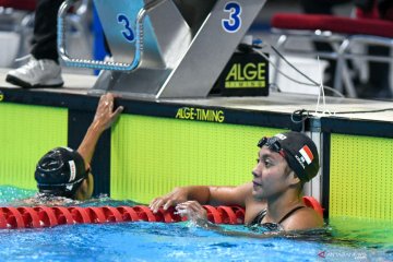 Perenang asal Kota Surabaya Adinda Larasati Dewi (kanan) mengamati catatan waktu usai final 400 meter gaya bebas putri dalam Indonesia Open Swimming Championships 2019 di Stadion Akuatik, GBK, Jakarta, Jumat (13/12/2019). Adinda Larasati Dewi meraih emas dengan catatan waktu 04 menit 24.22 detik. ANTARA FOTO/M Risyal Hidayat/hp.