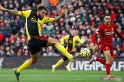 Pesepak bola Watford Troy Deeney (kiri) menendang bola ke arah pertahanan lawannya Liverpool dalam laga pekan ke-17 Liga Inggris, di Stadion Anfield, Liverpool, Inggris, Sabtu (14/12/2019). Babak pertama Liverpool memimpin 1-0 atas Watford berkat sumbangan gol dari Salah. ANTARA FOTO/Reuters-Phil Noble/hp.
