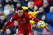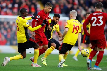 Pesepak bola Liverpool Roberto Firmino (cedua kiri) berupaya melewati penjagaan para pemain Watford dalam laga pekan ke-17 Liga Inggris, di Stadion Anfield, Liverpool, Inggris, Sabtu (14/12/2019). Babak pertama Liverpool memimpin 1-0 atas Watford berkat sumbangan gol dari Salah. ANTARA FOTO/Reuters-Phil Noble/hp.