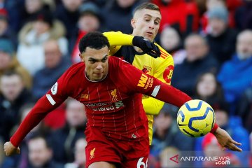 Pesepak bola Liverpool Trent Alexander-Arnold (kiri) berebut bola dengan pesepak bola Watford Gerard Deulofeu dalam laga pekan ke-17 Liga Inggris, di Stadion Anfield, Liverpool, Inggris, Sabtu (14/12/2019). Babak pertama Liverpool memimpin 1-0 atas Watford berkat sumbangan gol dari Salah. ANTARA FOTO/Reuters-Phil Noble/hp.