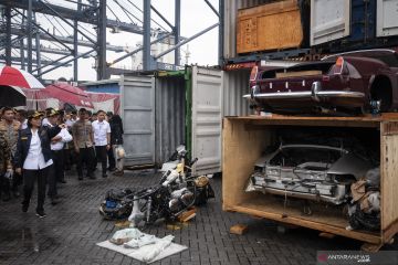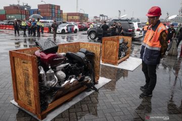Petugas mengamati salah satu motor sitaan saat rilis penyelundupan mobil dan motor mewah di Terminal Peti Kemas Tanjung Priok, Jakarta, Selasa (17/12/2019). Sepanjang tahun 2016 hingga 2019 sebanyak 19 unit mobil mewah dan 35 unit motor (rangka dan mesin motor) mewah berbagai merek telah diamankan oleh Bea Cukai Tanjung Priok dengan perkiraan total nilai barang mencapai kurang lebih Rp21 miliar dan potensi kerugian negara mencapai kurang lebih Rp48 miliar. ANTARA FOTO/Dhemas Reviyanto/wsj.