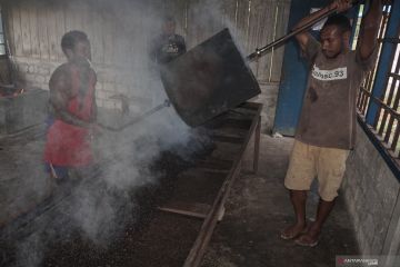 Dua orang menuang kopi ke saringan kawat di rumah produksi Koperasi Unit Desa (KUD) Rimba Kakupi Ambaidiru, Kepuluan Yapen, Papua, Rabu (18/12/19). Kopi jenis robusta asal Ambaidiru Kepulauan Yapen adalah salah satu kopi terbaik asal Papua yang telah menembus pasar Nasional bahkan Internasional. ANTARA FOTO/Indrayadi TH/ama.