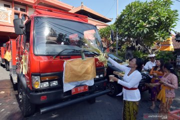 Petugas BPBD Denpasar menyiapkan sarana upacara pada truk pemadam kebakaran menjelang persembahyangan Hari Raya Tumpek Landep di kantor Badan Penanggulangan Bencana Daerah (BPBD) Kota Denpasar, Bali, Sabtu (21/12/2019). Hari Raya Tumpek Landep tersebut merupakan upacara pembersihan dan penyucian yang bermakna untuk memohon penajaman pikiran dalam menggunakan ilmu pengetahuan dan teknologi yang disimboliskan dengan mengupacarai persenjataan atau peralatan berbahan besi. ANTARA FOTO/Nyoman Hendra Wibowo/nym/ama.