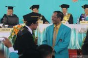 Menko Polhukam Mahfud MD (kanan) berjabat tangan dengan rektor Universitas Islam Kadiri (Uniska) Prof Ali Maschan Moesa (kiri) usai menyampaikan orasi ilmiah saat wisuda Uniska di Kota Kediri, Jawa Timur, Sabtu (21/12/2019). Mahfud MD dalam orasi ilmiahnya menyatakan pentingnya agama dalam membentuk moralitas dan penyeimbang ilmu pengetahuan. ANTARA FOTO/Prasetia Fauzani/ama.