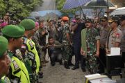 Panglima TNI Marsekal TNI Hadi Tjahjanto (ketiga kanan), Kapolri Jenderal Pol Idham Azis (kiri) dan Kapolda NTT Irjen Pol Hamidin (kedua kanan) memberikan arahan kepada personel TNI dan Polri yang bertugas mengamankan Gereja GMIT Koinonia Kupang saat melakukan kunjungan kerja ke Kupang, NTT, Minggu, (22/12/19). Kunjungan kerja Panglima TNI dan Kapolri ke NTT dalam rangka memantau serta memastikan kesiapan personel TNI dan Polri dalam mengamankan Natal dan Tahn Baru di NTT. ANTARA FOTO/Kornelis Kaha/wsj.