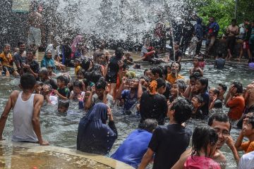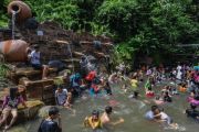 Pengunjung menikmati wahana permainan air di Kawasan wisata Gunung Galunggung, Kabupaten Tasikmalaya, Jawa Barat, Minggu (22/12/2019). Pengunjung yang didominasi anak-anak sekolah itu memanfaatkan hari liburnya untuk mengunjungi kawasan wisata Gunung Galunggung yang menyediakan pemadian air panas. ANTARA FOTO/Adeng Bustomi/aww.