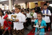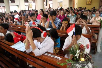 Sejumlah anak jamaat Katolik mengenakan pakaian adat Nusantara saat mengikuti misa Natal di Gereja Santo Servatius, Kampung Sawah, Bekasi, Jawa Barat, Rabu (25/12/2019). Ibadah Natal jamaat itu mengangkat tema " Hiduplah Sebagai Sahabat Bagi Semua Orang" yang dimaknai sebagai menumbuhkan rasa kerukunan serta keharmonisan sejak dini tanpa membedakan suku, budaya dan agama. ANTARA FOTO/Risky Andrianto/ama.