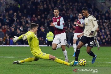 Pemain Manchester United Marcus Rashford mencetak gol ke gawang Burnley pada pertandingan Liga Inggris di Turf Moor, Burnley, Sabtu (28/12/2019). MU menang dengan skor 2-0 dan menduduki peringkat lima menggeser Tottenham Hostspur. ANTARA FOTO/REUTERS/Phil Noble/pras.