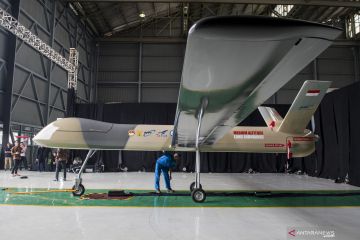 Pengunjung melihat pesawat udara nirawak (PUNA) jenis Medium Altitude Long Endurance (MALE) saat pengenalan perdana di hanggar PT Dirgantara Indonesia (Persero), Bandung, Jawa Barat, Senin (30/12/2019). Prototipe Puna Male pertama ini mampu terbang selama 24-30 jam dengan ketinggian jelajah 3.000 hingga 6.000 meter yang diperuntukan mengawasi wilayah NKRI dari ancaman daerah perbatasan, terorisme, penyelundupan, pembajakan serta pencurian sumber daya alam. ANTARA FOTO/M Agung Rajasa/aww