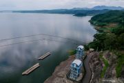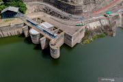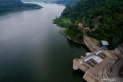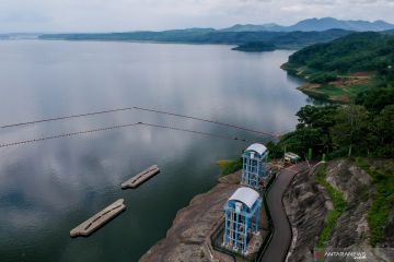 Foto udara bendungan Waduk Cirata di Kabupaten Bandung Barat, Jawa Barat, Jumat (3/1/2020). Pemerintah bekerja sama dengan perusahaan pengembang energi terbarukan asal Uni Emirat Arab (UEA) dan Masdar akan membangun Pembangkit Listrik Tenaga Surya (PLTS) terapung pertama di Indonesia di Waduk Cirata dengan kapasitas 145 megawatt yang digadang-gadang akan menjadi PLTS terapung terbesar se-Asia Tenggara. ANTARA FOTO/Raisan Al Farisi/pras.
