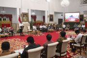 Presiden Joko Widodo (ketiga kiri) didampingi Wakil Presiden Ma'ruf Amin (keempat kiri) memberikan arahan ketika memimpin Sidang Kabinet Paripurna di Istana Negara, Jakarta, Senin (6/1/2020). Pada sidang Kabinet Paripurna yang membahas penetapan RPJMN 2020 - 2024 tersebut Presiden menegaskan tidak ada tawar menawar dalam kasus Natuna. ANTARA FOTO/Wahyu Putro A/ama.