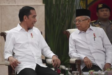 Presiden Joko Widodo (kiri) berbincang dengan Wakil Presiden Ma'ruf Amin ketika memimpin Sidang Kabinet Paripurna di Istana Negara, Jakarta, Senin (6/1/2020). Pada sidang Kabinet Paripurna yang membahas penetapan RPJMN 2020 -2024 tersebut Presiden menegaskan tidak ada tawar menawar dalam kasus Natuna. ANTARA FOTO/Wahyu Putro A/ama.
