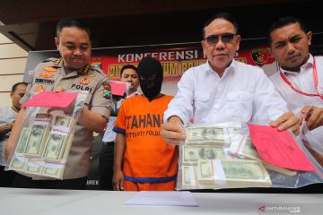 Polisi menunjukkan barang bukti dan tersangka saat ungkap kasus peredaran uang palsu di Polda Jawa Timur, Surabaya, Jawa Timur, Senin (6/1/2020). Direktorat Reserse Kriminal Umum Polda Jawa Timur menangkap tersangka berinisial MY (53) atas kasus dugaan mengedarkan uang dolar Amerika Serikat palsu dan mengamankan barang bukti uang dolar Amerika Serikat palsu sebanyak 1.000 lembar pecahan seratus dolar Amerika Serikat. ANTARA FOTO/Didik Suhartono/aww.