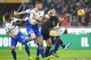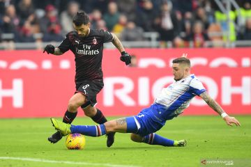 Pemain AC Milan Suso berebut bola dengan pemain Sampdoria Julian Chabot pada pertandingan Serie A di stadion San Siro, Milan, Senin (6/1/2020). Kedua tim bermain imbang 0-0. ANTARA FOTO/REUTERS/Daniele Mascolo/pras.