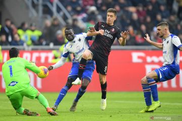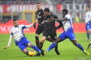 Pemain AC Milan Suso berebut bola dengan pemain Sampdoria Omar Colley dan Emil Audero pada pertandingan Serie A di stadion San Siro, Milan, Senin (6/1/2020). Kedua tim bermain imbang 0-0. ANTARA FOTO/REUTERS/Daniele Mascolo/pras.