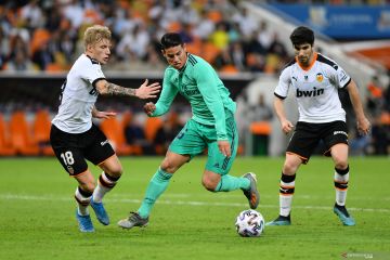 Pemain Real Madrid James Rodriguez berebut bola dengan pemain Valencia Daniel Wass pada pertandingan semifinal Piala Super Spanyol di King Abdullah Sports City, Jeddah, Arab Saudi, Rabu (8/1/2020) waktu setempat. Madrid menang dengan skor 3-1. ANTARA FOTO/REUTERS/Waleed Ali/pras.