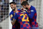 Pemain Barcelona Gerard Pique (kanan) merayakan gol dengan Luis Suarez (kiri) dan Arturo Vidal yang kemudian dianulir wasit setelah dirujuk ke VAR pada laga semi final Piala Super Spanyol melawan Atletico Madrid di Raja Abdullah Sports City, Jeddah, Arab Saudi, Kamis (9/1/2020). Atletico Madrid memenangi pertandingan dengan skor 3-2. ANTARA FOTO/REUTERS/Waleed Ali/aww.