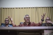 Ketua KPU Arief Budiman (tengah) bersama Komisioner KPU Hasyim Asy'ari (kiri) dan Evi Novida Ginting Manik (kanan) memberikan keterangan pers soal kasus penetapan calon terpilih anggota DPR Pemilu 2019 PDI Perjuangan Dapil Sumsel I di Kantor KPU Pusat, Jakarta, Jumat (10/1/2020). KPU menegaskan bahwa keputusan penetapan Penggantian Antar Waktu (PAW) anggota DPR periode 2019-2024 merujuk pada Undang-Undang bukan fatwa Mahkamah Agung dan saat ini KPU juga telah menerima surat pengunduran diri dari Wahyu Setiawan sebagai Komisioner KPU. ANTARA FOTO/Aprillio Akbar/wsj.