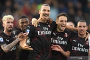 Pemain AC Milan Zlatan Ibrahimovic, Giacomo Bonaventura, Ismael Bennacer, Samu Castillejo dan Rafael Leao merayakan gol kedua le gawang Cagliari pada pertandingan Liga Italia Serie A di Sardena Arena, Cagliari, Sabtu (11/1/2020). AC Milan menang dengan skor 2-0. ANTARA FOTO/REUTERS/Daniele Mascolo/ Bildbyran/pras.
