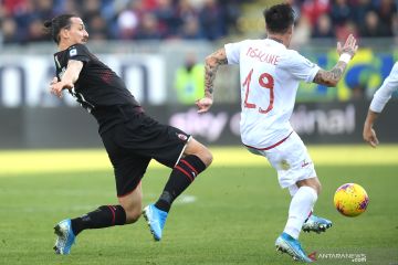 Pemain AC Milan Zlatan Ibrahimovic mencoba merebut bola dari kaki pemain Cagliari pada pertandingan Liga Italia Serie A di Sardena Arena, Cagliari, Sabtu (11/1/2020). AC Milan menang dengan skor 2-0. ANTARA FOTO/REUTERS/Daniele Mascolo/ Bildbyran/pras.