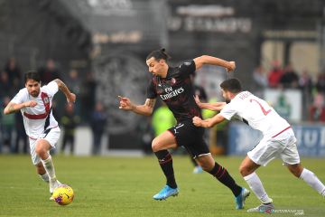 Pemain AC Milan Zlatan Ibrahimovic menggiring bola saat melawan Cagliari pada pertandingan Liga Italia Serie A di Sardena Arena, Cagliari, Sabtu (11/1/2020). AC Milan menang dengan skor 2-0. ANTARA FOTO/REUTERS/Daniele Mascolo/ Bildbyran/pras.