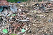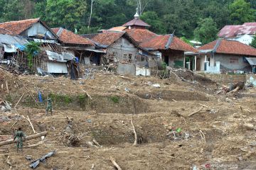 Prajurit TNI AD berjalan di lokasi bencana tanah longsor Kampung Sinar Harapan, Desa Harkat Jaya, Kecamatan Sukajaya, Kabupaten Bogor, Jawa Barat, Senin (13/1/2020). Basarnas menyatakan pencarian tiga korban tanah longsor di kampung tersebut dihentikan karena kondisi medan dan cuaca menjadi kendala serta akses alat berat yang tidak bisa masuk ke lokasi kejadian. ANTARA FOTO/Arif Firmansyah/foc.