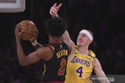 Pebasket Cleveland Cavaliers Collin Sexton (bawah) berebut bola dengan pebasket Los Angeles Lakers Kyle Kuzma (atas) dalam pertandingan babak lanjutan NBA, di Staples Center, Los Angeles, California, AS, Senin (13/1/2020). Lakers berhasil menumbangkan Cleveland Cavaliers 128-99. ANTARA FOTO/Reuters-Robert Hanashiro-USA TODAY Sports/hp.
