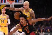 Pebasket Los Angeles Lakers Alex Caruso (kanan) mencoba menghentikan laju serangan dari pebasket Cleveland Cavaliers Collin Sexton (kiri) dalam pertandingan babak lanjutan NBA, di Staples Center, Los Angeles, California, AS, Senin (13/1/2020). Lakers berhasil menumbangkan Cleveland Cavaliers 128-99. ANTARA FOTO/Reuters-Robert Hanashiro-USA TODAY Sports/hp.