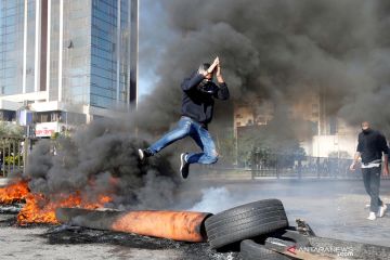 Seorang pengunjuk rasa melompati barikade yang terbakar saat aksi protes atas kesulitan ekonomi di Beirut, Lebanon, Selasa (14/1/2020). ANTARA FOTO/REUTERS/Mohamed Azakir/aww.