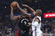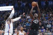 Pebasket Toronto Raptors Pascal Siakam (kanan) berupaya memasukkan bola ke ring lawan yang dijaga pebasket Oklahoma City Thunder Steven Adams (kedua kiri) dalam laga lanjutan NBA, di Chesapeake Energy Arena, Oklahoma City, Oklahoma, AS, Rabu (15/1/2020). Raptors berhasil mengalahkan Oklahoma City Thunder 130-121. ANTARA FOTO/Reuters- Alonzo Adams-USA TODAY Sports/hp.