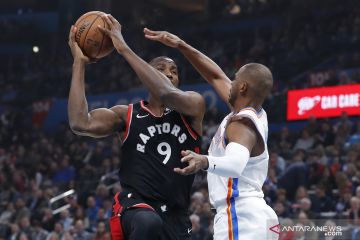 Pebasket Toronto Raptors Serge Ibaka (kiri) berupaya memasukan bola yang dijaga pebakset Oklahoma City Thunder Chris Paul (kanan) dalam laga lanjutan NBA, di Chesapeake Energy Arena, Oklahoma City, Oklahoma, AS, Rabu (15/1/2020). Raptors berhasil mengalahkan Oklahoma City Thunder 130-121. ANTARA FOTO/Reuters- Alonzo Adams-USA TODAY Sports/hp.