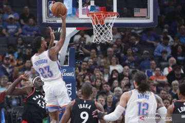 Pebasket Oklahoma City Thunder Terrance Ferguson (kiri) berupaya memasukkan bola ke dalam ring lawan saat melawan Toronto Raptors dalam laga lanjutan NBA, di Chesapeake Energy Arena, Oklahoma City, Oklahoma, AS, Rabu (15/1/2020). Raptors berhasil mengalahkan Oklahoma City Thunder 130-121. ANTARA FOTO/Reuters- Alonzo Adams-USA TODAY Sports/hp.