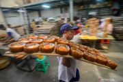 Pekerja membawa dodol untuk dikemas di rumah produksi dodol keranjang Tekkie di Bandung, Jawa Barat, Kamis (16/1/2020). Jelang perayaan Imlek, rumah produksi dodol keranjang Tekkie dapat memproduksi 4.000 dodol per hari yang didistribusikan ke berbagai Kota di Jawa Barat. ANTARA FOTO/Raisan Al Farisi/pras.