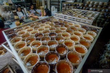 Pekerja menyelesaikan produksi dodol keranjang Tekkie di Bandung, Jawa Barat, Kamis (16/1/2020). Jelang perayaan Imlek, rumah produksi dodol keranjang Tekkie dapat memproduksi 4.000 dodol per hari yang didistribusikan ke berbagai Kota di Jawa Barat. ANTARA FOTO/Raisan Al Farisi/pras.