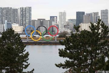 Cincin Olimpiade terpasang di tepi laut menjelang perayaan enam bulan menuju pembukaan Olimpiade Tokyo 2020 di Odaiba Marine Park, Tokyo, Jepang, Jumat (17/1/2020). ANTARA FOTO/REUTERS/Issei Kato/wsj.