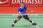 Pebulu tangkis tungal putra Indonesia Jonatan Christie mengembalikan kok ke arah lawannya Anders Antonsen dari Denmark dalam babak perempat final Daihatsu Indonesia Masters 2020 di Istora Senayan, Jakarta, Jumat (17/1/2020). Jonatan kalah dengan skor 14-21, 21-10 dan 12-21. ANTARA FOTO/Galih Pradipta/hp.