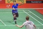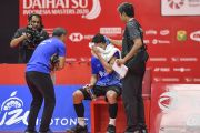 Pebulu tangkis tungal putra Indonesia Jonatan Christie (tengah) mendengarkan instruksi pelatih disela pertandingan melawan pebulu tangkis Denmark Anders Antonsen dalam babak perempat final Daihatsu Indonesia Masters 2020 di Istora Senayan, Jakarta, Jumat (17/1/2020). Jonatan kalah dengan skor 14-21, 21-10 dan 12-21. ANTARA FOTO/Galih Pradipta/hp.