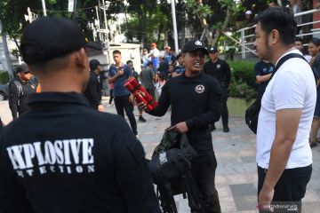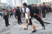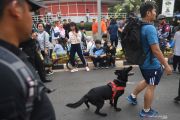 Anjing pelacak dari Unit K-9 Polri mengendus adanya bom yang dibawa oleh seseorang di dalam tasnya saat simulasi di kawasan hari bebas kendaraan bermotor atau car free day (CFD) di Jalan MH Thamrin, Jakarta, Minggu (19/1/2020). Simulasi tersebut bertujuan untuk meningkatkan kewaspadaan akan bahaya terorisme. ANTARA FOTO/Akbar Nugroho Gumay/wsj.