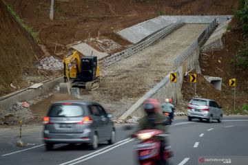 Sejumlah kendaraan melintas di dekat proyek pembangunan jalur penyelamat di Tanjakan Emen, Kabupaten Subang, Jawa Barat, Minggu (19/1/2020). Pemerintah Provinsi Jawa Barat membangun enam titik jalur penyelamat di sepanjang Tanjakan Emen yang memiliki panjang tujuh kilometer guna meminimalisir kecelakaan yang kerap kali terjadi di tanjakan tersebut. ANTARA FOTO/Raisan Al Farisi/wsj.